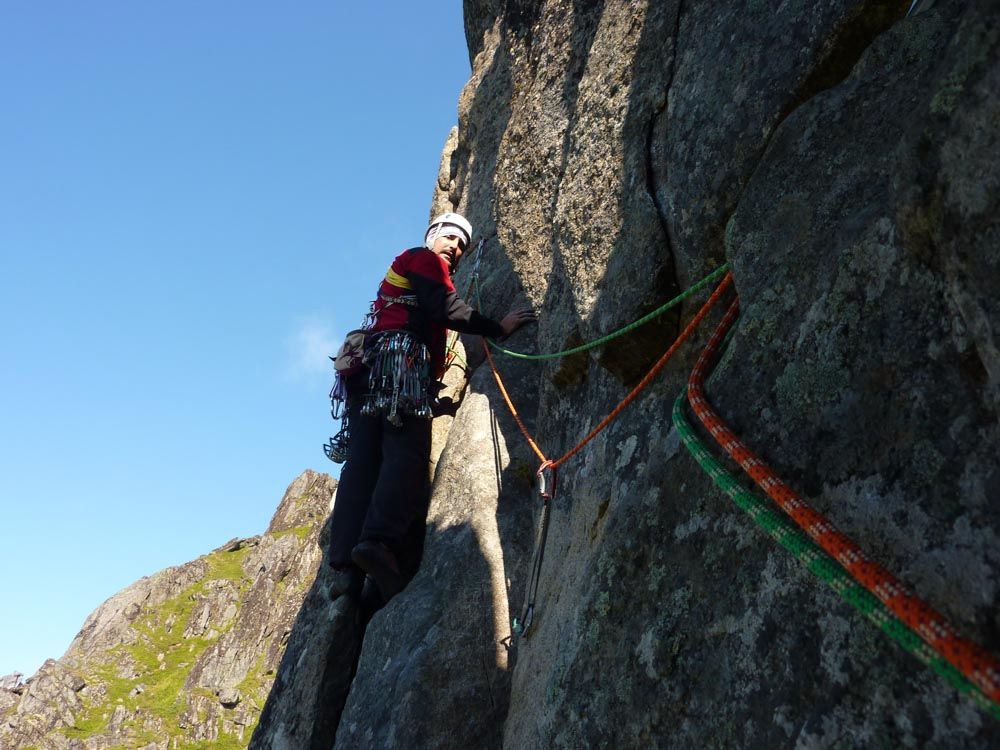 La progresión por la pared es sencilla, la roca es buena y el tiempo perfecto, así que pronto, las dos cordadas estamos en la pared. En cuanto se libera una reunión la segunda cordada llega a ella para asegurar al segundo. La vía presenta su máximo grado en el acceso a la repisa previa al último largo de escalada.