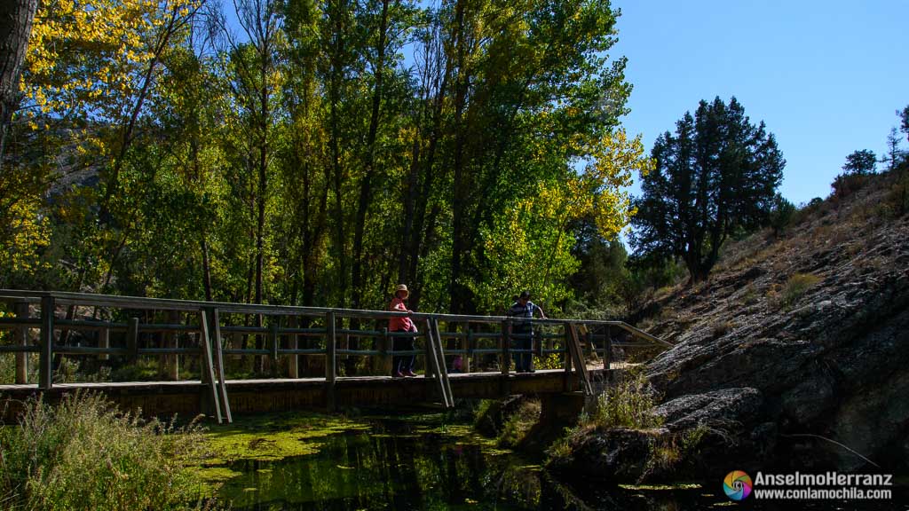 La senda continúa hasta llegar al segundo puente que pasa sobre el cauce, en estas fechas seco, del riachuelo que viene desde la cascada de la fuentona, cascada que no visitamos, ya que en estas fechas estaba también seca y además se nos llegaba la hora de comer. Justo antes del puente, sale el camino que lleva a la cascada.